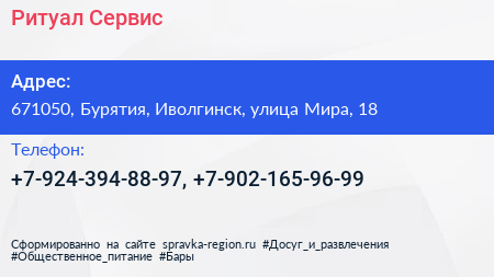 Ритуал Сервис по адресу 671050, Бурятия, Иволгинск, улица Мира, 18 в дальнейшем Организация, размещена в следующих категориях: