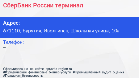 СберБанк России, терминал по адресу 671110, Бурятия, Иволгинск, Школьная улица, 10а в дальнейшем Организация, размещена в следующих категориях:
