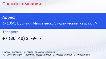 Спектр, компания по адресу 671050, Бурятия, Иволгинск, Студенческий квартал, 9 в дальнейшем Организация, размещена в следующих категориях: