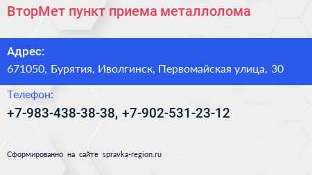 ВторМет, пункт приема металлолома по адресу 671050, Бурятия, Иволгинск, Первомайская улица, 30 в дальнейшем Организация, размещена в следующих категориях:
