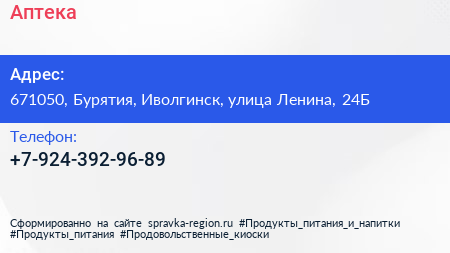 Аптека по адресу 671050, Бурятия, Иволгинск, улица Ленина, 24Б в дальнейшем Организация, размещена в следующих категориях: