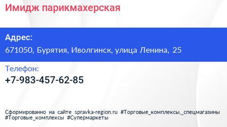 Имидж, парикмахерская по адресу 671050, Бурятия, Иволгинск, улица Ленина, 25 в дальнейшем Организация, размещена в следующих категориях: