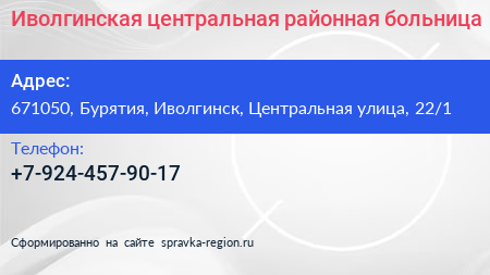 Иволгинская центральная районная больница по адресу 671050, Бурятия, Иволгинск, Центральная улица, 22/1 в дальнейшем Организация, размещена в следующих категориях: