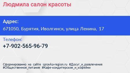 Людмила, салон красоты по адресу 671050, Бурятия, Иволгинск, улица Ленина, 17 в дальнейшем Организация, размещена в следующих категориях: