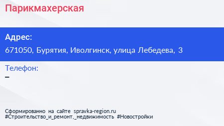 Парикмахерская по адресу 671050, Бурятия, Иволгинск, улица Лебедева, 3 в дальнейшем Организация, размещена в следующих категориях: