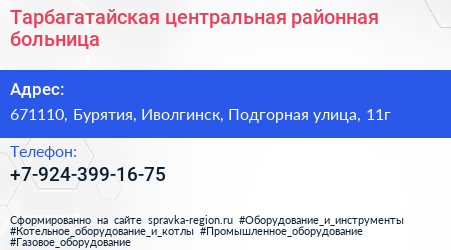 Тарбагатайская центральная районная больница по адресу 671110, Бурятия, Иволгинск, Подгорная улица, 11г в дальнейшем Организация, размещена в следующих категориях: