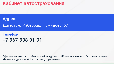Кабинет автострахования по адресу Дагестан, Избербаш, Гамидова, 57 в дальнейшем Организация, размещена в следующих категориях: