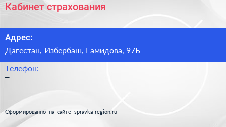 Кабинет страхования по адресу Дагестан, Избербаш, Гамидова, 97Б в дальнейшем Организация, размещена в следующих категориях: