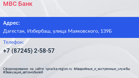 МВС Банк по адресу Дагестан, Избербаш, улица Маяковского, 139Б в дальнейшем Организация, размещена в следующих категориях: