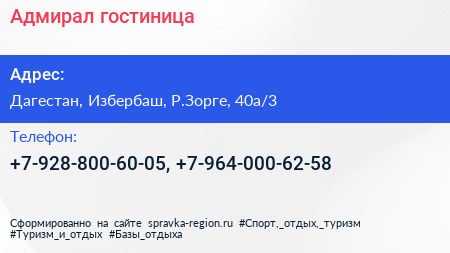 Адмирал, гостиница по адресу Дагестан, Избербаш, Р.Зорге, 40а/3 в дальнейшем Организация, размещена в следующих категориях:
