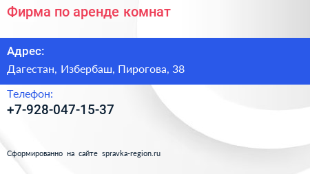 Фирма по аренде комнат по адресу Дагестан, Избербаш, Пирогова, 38 в дальнейшем Организация, размещена в следующих категориях: