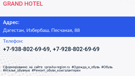 GRAND HOTEL по адресу Дагестан, Избербаш, Песчаная, 88 в дальнейшем Организация, размещена в следующих категориях:
