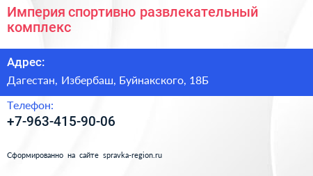 Империя, спортивно-развлекательный комплекс по адресу Дагестан, Избербаш, Буйнакского, 18Б в дальнейшем Организация, размещена в следующих категориях: