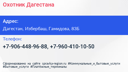 Охотник Дагестана по адресу Дагестан, Избербаш, Гамидова, 83Б в дальнейшем Организация, размещена в следующих категориях: