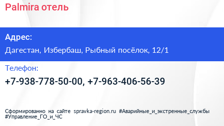Palmira, отель по адресу Дагестан, Избербаш, Рыбный посёлок, 12/1 в дальнейшем Организация, размещена в следующих категориях: