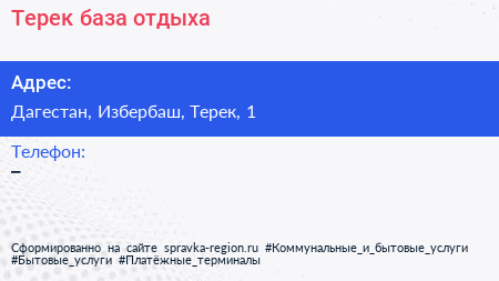 Терек, база отдыха по адресу Дагестан, Избербаш, Терек, 1 в дальнейшем Организация, размещена в следующих категориях:
