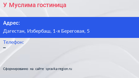 У Муслима, гостиница по адресу Дагестан, Избербаш, 1-я Береговая, 5 в дальнейшем Организация, размещена в следующих категориях:
