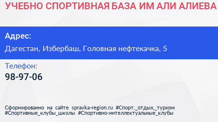 УЧЕБНО-СПОРТИВНАЯ БАЗА ИМ. АЛИ АЛИЕВА по адресу Дагестан, Избербаш, Головная нефтекачка, 5 в дальнейшем Организация, размещена в следующих категориях: