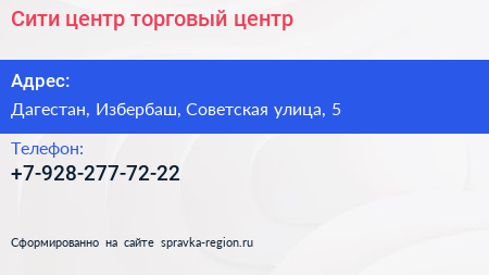 Сити центр, торговый центр по адресу Дагестан, Избербаш, Советская улица, 5 в дальнейшем Организация, размещена в следующих категориях: