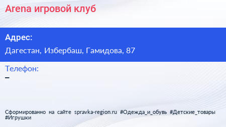 Arena, игровой клуб по адресу Дагестан, Избербаш, Гамидова, 87 в дальнейшем Организация, размещена в следующих категориях: