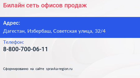 Билайн, сеть офисов продаж по адресу Дагестан, Избербаш, Советская улица, 32/4 в дальнейшем Организация, размещена в следующих категориях: