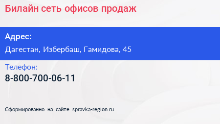 Билайн, сеть офисов продаж по адресу Дагестан, Избербаш, Гамидова, 45 в дальнейшем Организация, размещена в следующих категориях: