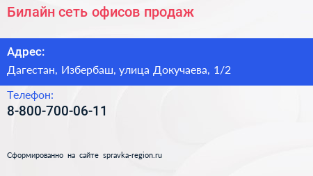 Билайн, сеть офисов продаж по адресу Дагестан, Избербаш, улица Докучаева, 1/2 в дальнейшем Организация, размещена в следующих категориях: