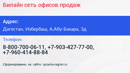 Билайн, сеть офисов продаж по адресу Дагестан, Избербаш, А.Абу-Бакара, 3д в дальнейшем Организация, размещена в следующих категориях: