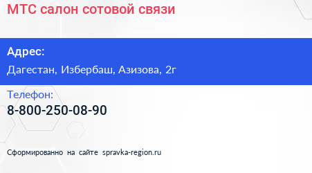МТС, салон сотовой связи по адресу Дагестан, Избербаш, Азизова, 2г в дальнейшем Организация, размещена в следующих категориях: