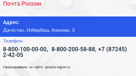 Почта России по адресу Дагестан, Избербаш, Азизова, 3 в дальнейшем Организация, размещена в следующих категориях: