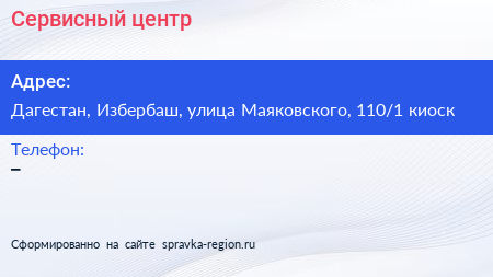 Сервисный центр по адресу Дагестан, Избербаш, улица Маяковского, 110/1 киоск в дальнейшем Организация, размещена в следующих категориях:
