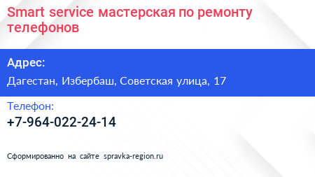 Smart service, мастерская по ремонту телефонов по адресу Дагестан, Избербаш, Советская улица, 17 в дальнейшем Организация, размещена в следующих категориях: