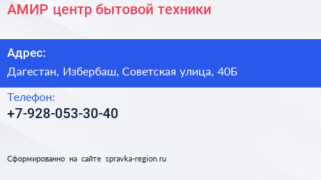 АМИР, центр бытовой техники по адресу Дагестан, Избербаш, Советская улица, 40Б в дальнейшем Организация, размещена в следующих категориях: