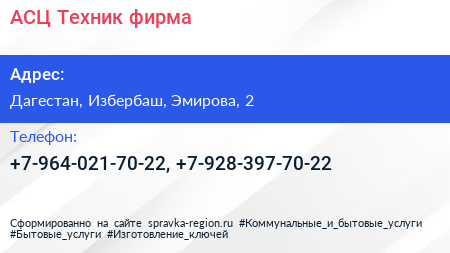 АСЦ Техник, фирма по адресу Дагестан, Избербаш, Эмирова, 2 в дальнейшем Организация, размещена в следующих категориях: