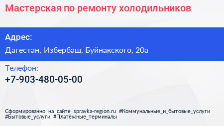 Мастерская по ремонту холодильников по адресу Дагестан, Избербаш, Буйнакского, 20а в дальнейшем Организация, размещена в следующих категориях: