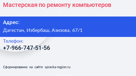 Мастерская по ремонту компьютеров по адресу Дагестан, Избербаш, Азизова, 67/1 в дальнейшем Организация, размещена в следующих категориях: