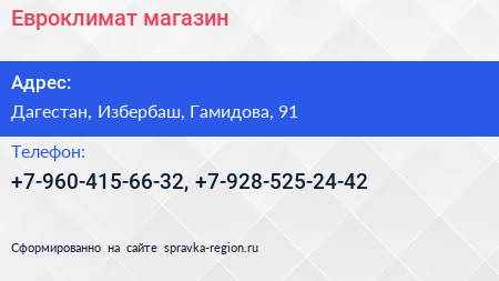 Евроклимат, магазин по адресу Дагестан, Избербаш, Гамидова, 91 в дальнейшем Организация, размещена в следующих категориях: