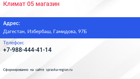 Климат 05, магазин по адресу Дагестан, Избербаш, Гамидова, 97Б в дальнейшем Организация, размещена в следующих категориях:
