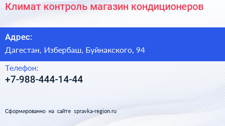 Климат контроль, магазин кондиционеров по адресу Дагестан, Избербаш, Буйнакского, 94 в дальнейшем Организация, размещена в следующих категориях: