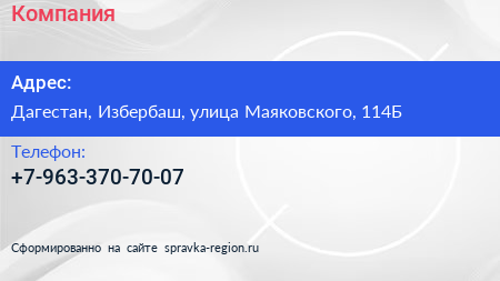 Компания по адресу Дагестан, Избербаш, улица Маяковского, 114Б в дальнейшем Организация, размещена в следующих категориях: