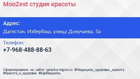 MooZest, студия красоты по адресу Дагестан, Избербаш, улица Докучаева, 5а в дальнейшем Организация, размещена в следующих категориях: