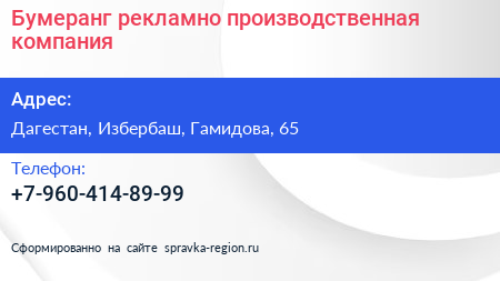 Бумеранг, рекламно-производственная компания по адресу Дагестан, Избербаш, Гамидова, 65 в дальнейшем Организация, размещена в следующих категориях: