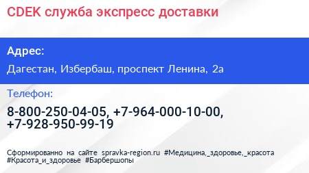 CDEK, служба экспресс-доставки по адресу Дагестан, Избербаш, проспект Ленина, 2а в дальнейшем Организация, размещена в следующих категориях: