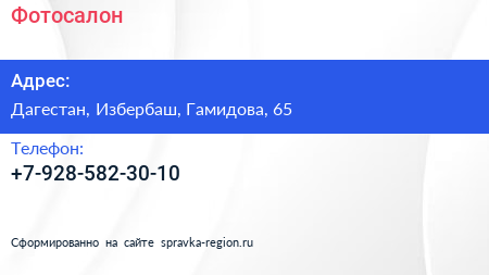 Фотосалон по адресу Дагестан, Избербаш, Гамидова, 65 в дальнейшем Организация, размещена в следующих категориях: