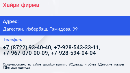 Хайри, фирма по адресу Дагестан, Избербаш, Гамидова, 99 в дальнейшем Организация, размещена в следующих категориях: