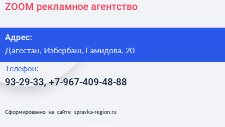 ZOOM, рекламное агентство по адресу Дагестан, Избербаш, Гамидова, 20 в дальнейшем Организация, размещена в следующих категориях: