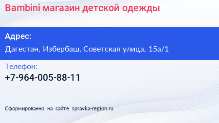 Bambini, магазин детской одежды по адресу Дагестан, Избербаш, Советская улица, 15а/1 в дальнейшем Организация, размещена в следующих категориях: