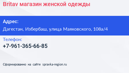 Britav, магазин женской одежды по адресу Дагестан, Избербаш, улица Маяковского, 108а/4 в дальнейшем Организация, размещена в следующих категориях: