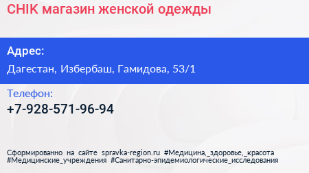 CHIK, магазин женской одежды по адресу Дагестан, Избербаш, Гамидова, 53/1 в дальнейшем Организация, размещена в следующих категориях: