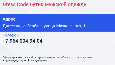 Dress Code, бутик мужской одежды по адресу Дагестан, Избербаш, улица Маяковского, 1 в дальнейшем Организация, размещена в следующих категориях:
